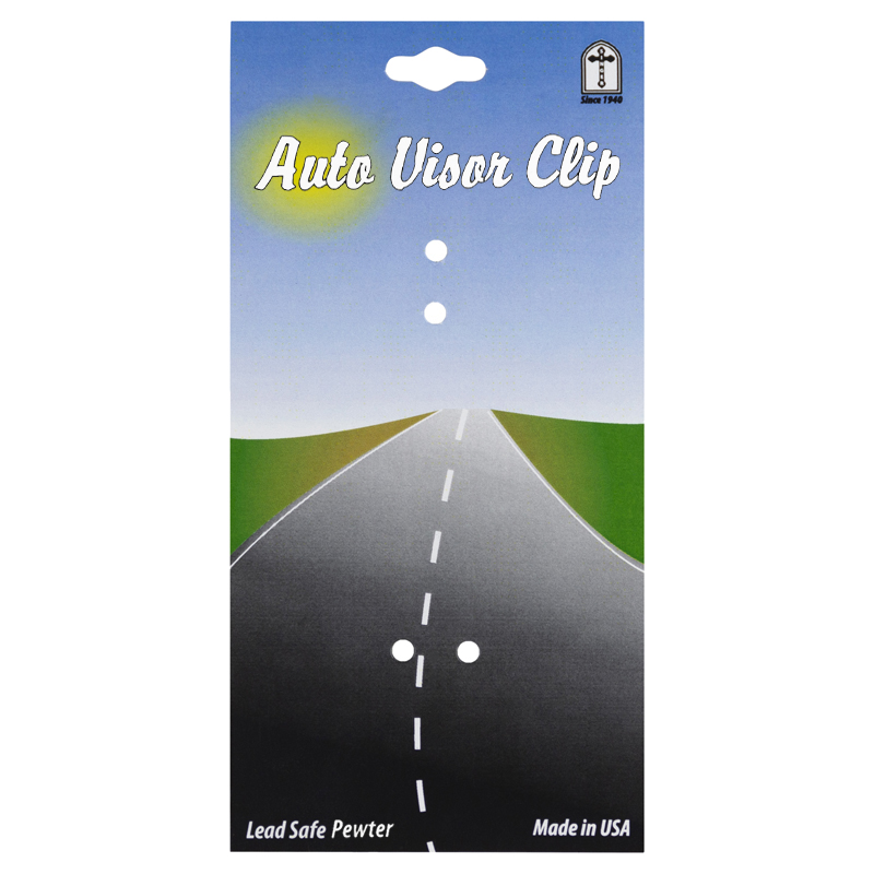 1-1/2 x 1-1/2 inch diamond shaped and pierced antiqued fine pewter St. Christopher, patron of travelers visor clip. The engraved phrase, "Behold St. Christopher and go your way in safety" borders the the visor clip. The visor clip comes carded.
