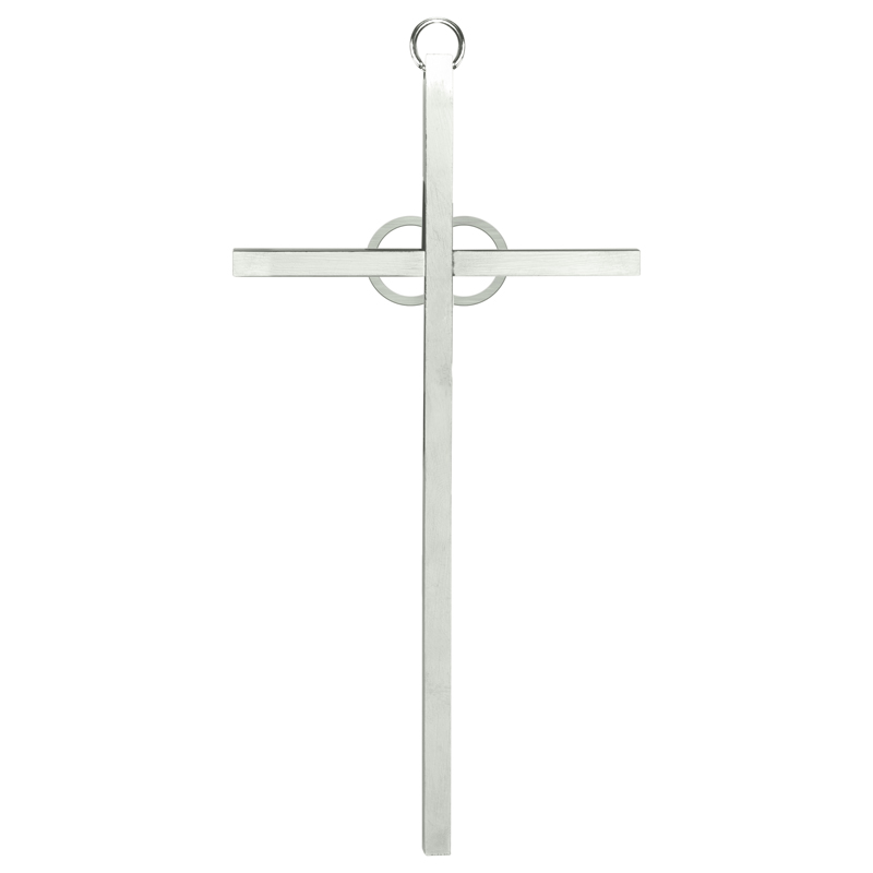 8 x 4 inch silver plated wedding wall cross. The design is a thin silver plated block wall cross. The center of the cross has two overlapping/interlocking rings to symbolize commitment of a couple to live and grow in gods grace. The top of the wall cross has a loop hole for hanging. Wall cross comes boxed.