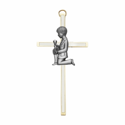4 x 2 inch white screened polished brass First Communion boy wall cross. The design includes a centered pewter kneeling First Communion boy holding chalice and grapes casting affixed to a white screened polished brass cross. Wall cross can be hanged with loop on top. Wall cross comes boxed.