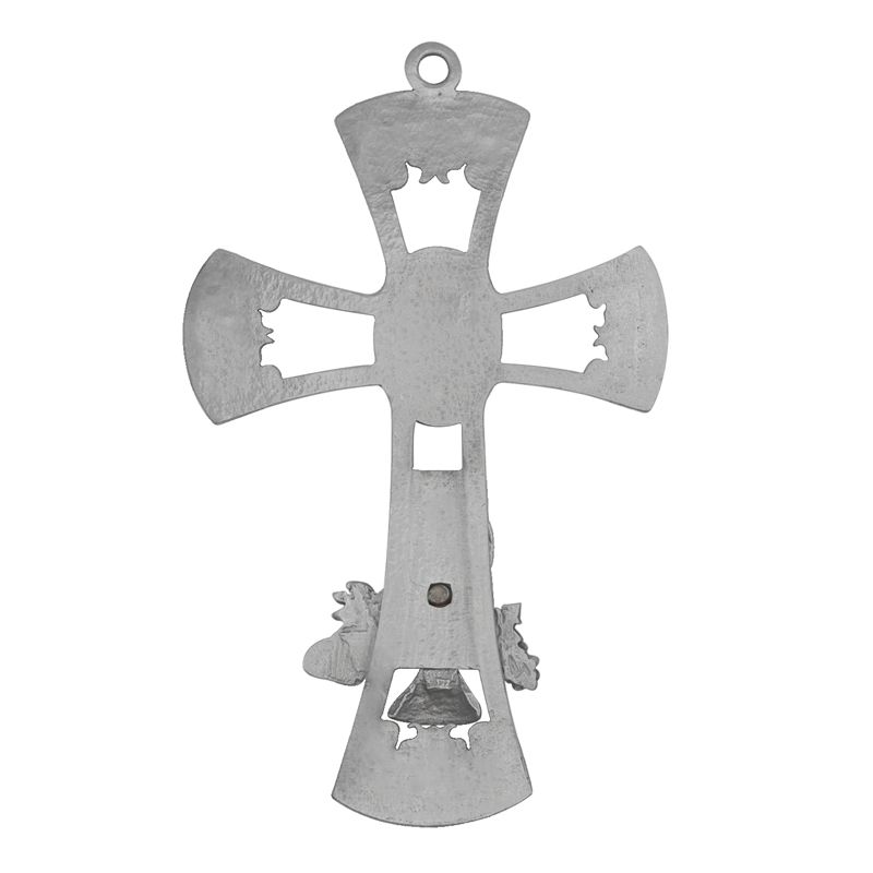 5-1/2 x 3-1/4 inch satin and antiqued finish pewter Communion Blessings wall cross. The cross features ornate detailing and has rounded edges. In the center of the cross, it reads "Communion Blessings". At the bottom of the cross is a raised image of a chalice with grapes and bread, representing the Eucharist. The Eucharist celebrates the real presence of Christ in the elements, where he is believed to be substantially present body, blood, soul, and divinity.