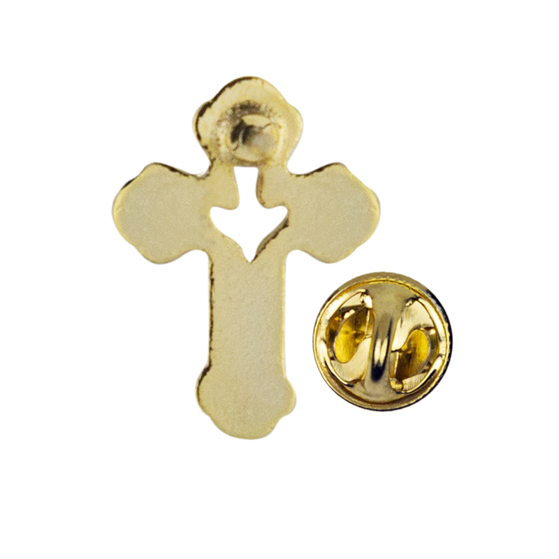 5/8 x 1/2 inch gold engraved and pierced descending dove on cross lapel pin. The design includes a centered pierced descending dove on a engraved and budded ends cross. The dove is the symbol of the Holy Spirit. When Christ was baptized by John the Baptist, a dove descended on him, according Matthew 3:16 and Mark 1:10. The back of the pin is blank with a gold polished finish and clutch back finding. The pin comes carded.