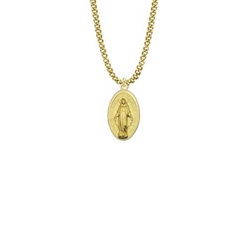 15/16 x 1/2 inch oval satin finish 10kt gold filled miraculous medal on an 18 inch stainless steel gold plated chain. The pendant features a gold satin finish oval with the figure of Mary in the center and a polished gold border. Surrounding Mary are the words, "O Mary, conceived without sin, pray for us who have recourse to thee." On the back of the medal in a brushed finish is the letter M, representing Mary, surmounted by a cross representing the sacrifice of Jesus, and surrounded by twelve stars that represent the twelve apostles. Includes an elegant deluxe velour jewelry box.