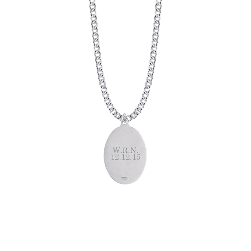 1-1/16 x 3/4 inch satin and enameled finish oval with blue enameled border sterling silver St. Christopher medal on a 24 inch stainless steel rhodium plated chain. The pendant features a raised figure of St. Christopher in the center, who is shown carrying a child on his shoulders. The center of the pendant has a satin finish. The outside border is enameled blue and has silver words around it that read, "Saint Christopher Protect Us". Known as the patron saint of travelers, a St. Christopher medal is traditionally worn by the wearer as a form of protection. Includes an elegant deluxe velour jewelry box.