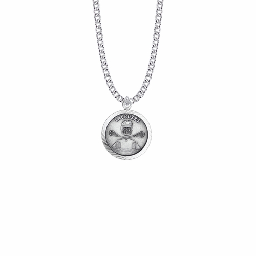 15/16 x 3/4 inch satin finish sterling silver boy's lacrosse medal on a 20 inch stainless steel rhodium plated chain. The front of the medal features a raised engraving of a lacrosse player helmet, sticks, and a field with goal posts. Across the top is the word "Lacrosse". On the back of the medal there is a raised engraving of St. Christopher, who is shown carrying a child on his shoulders, surrounded by the words, "Saint Christopher Protect Me". Includes an elegant deluxe velour jewelry box.