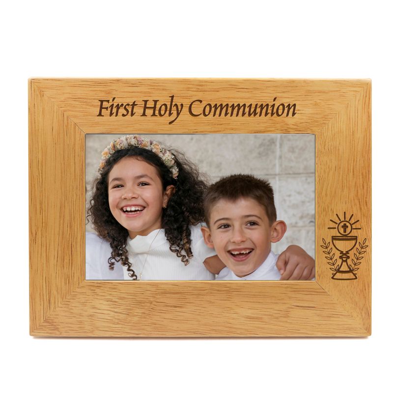9-1/8 x 7-1/8 inch hardwood and laser engraved personalized First Holy Communion photo frame. The photo frame holds a 4 x 6 inch photo and has an easel stand on the back. The top of the frame has the engraved phrase "First Holy Communion" and the bottom is blank and can be customized with your own message of up to three lines. The bottom right-hand side of the frame features an image of a chalice with the Eucharist above it with wheat stalks behind it. Includes an elegant Singer Company frame gift box.