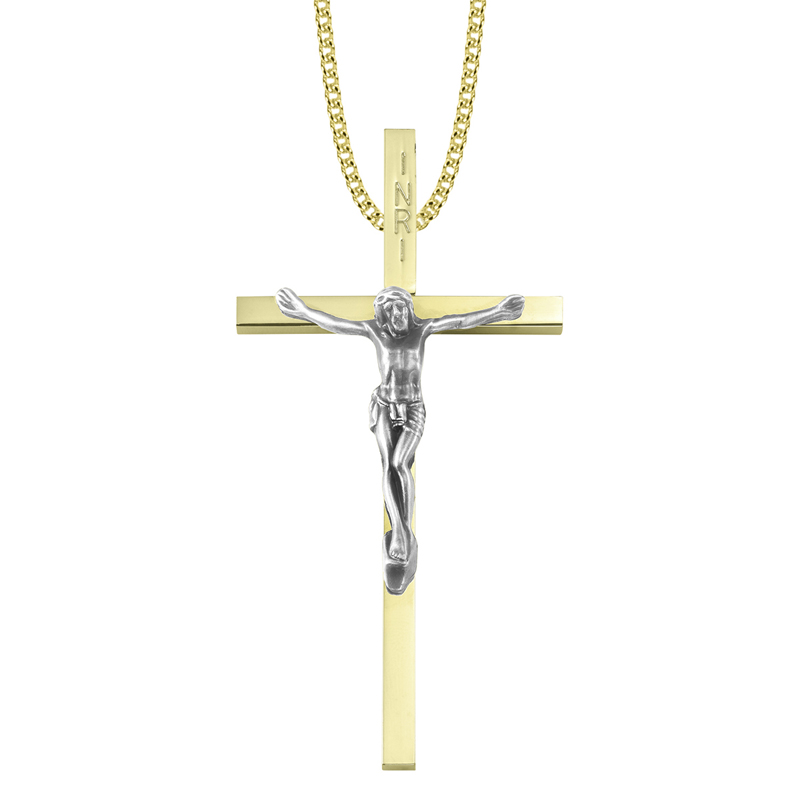 4 x 2 inch polished finish gold and silver plated clergy crucifix necklace on a 30 inch stainless steel gold plated chain. The crucifix pendant is plain in design and is gold. On it is a three dimensional silver figure of Jesus Christ with an antique finish. Includes a clergy crucifix box with insert and clear cover.