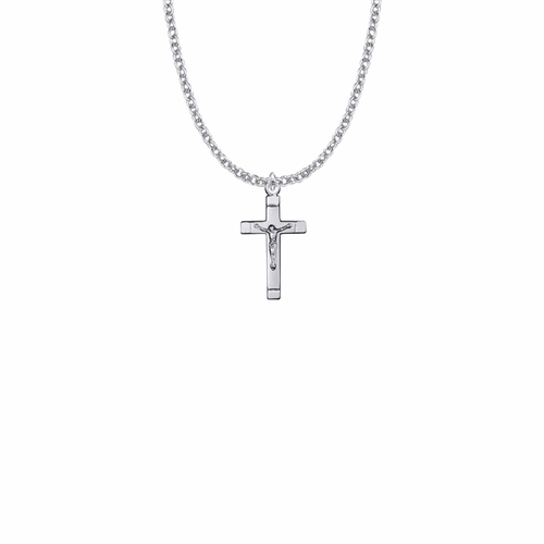 7/8 x 1/2 inch polished and satin finish sterling silver crucifix necklace on an 18 inch stainless steel rhodium plated chain. The crucifix pendant has a satin finish in the center and features polished finished ends.
